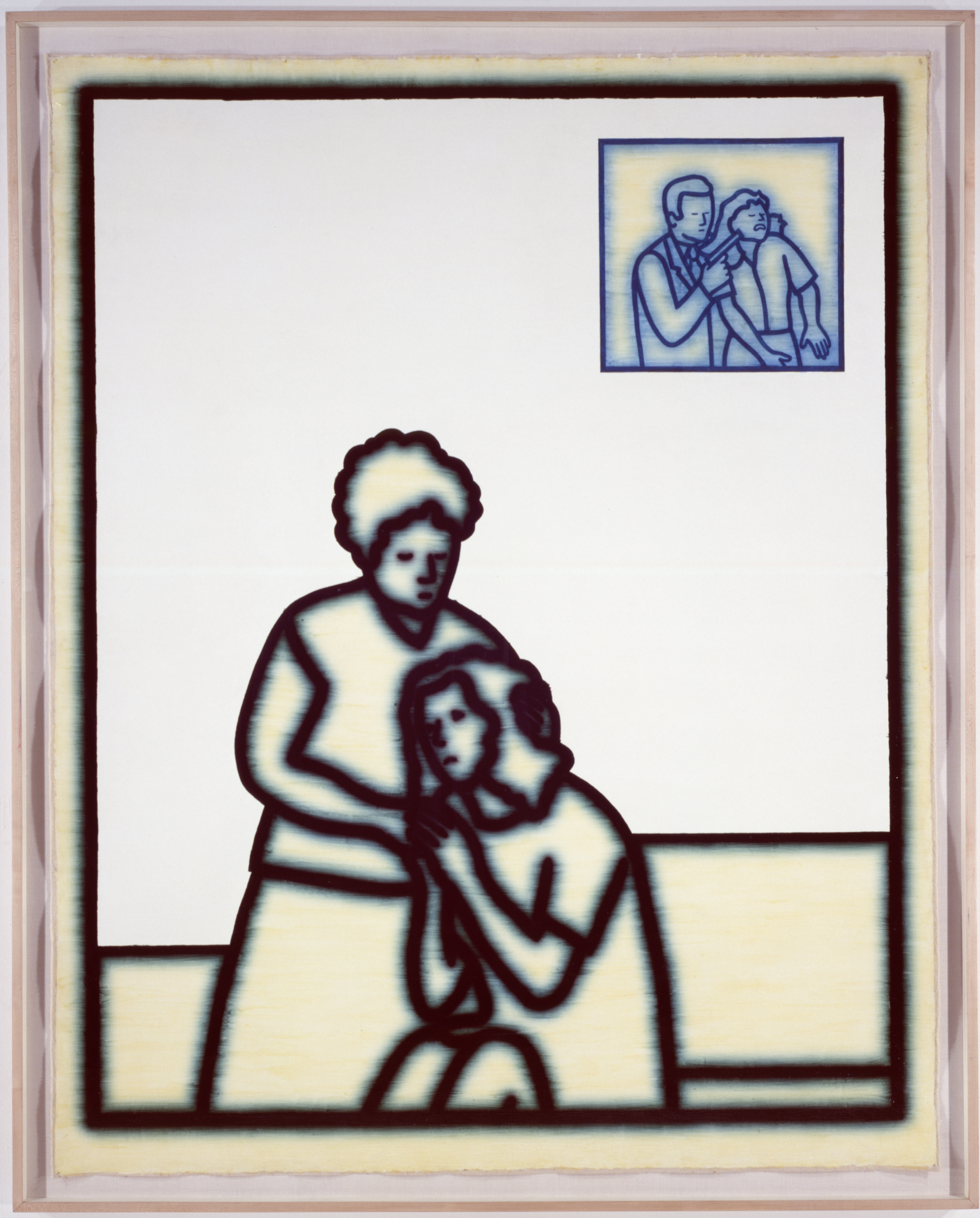 Applebroog's work has long been concerned with "performance", not only as represented by actors on stage, but also with each performance resulting In an object - an artifact - something that exists in space as well as time -images of frozen theatre. Her work deals primarily with everyday, private moments and awkward attempts at communication; feelings of isolation and alienation, frequently tinged with humor. Applebroog is first and foremost a social commentator presenting the vulnerability of human relationships. "CURRENT EVENTS" emphasizes the fact that the codes and communications of our culture have undergone a recent transformation - the conservative renaissance, the move back to traditionalism. Her social dramas come increasingly under the pressure of political change and are punctuated with "Abortion is murder", "South Africa appears to be stable", "Why else did God give us the bomb?,, they become part of her stories, of her performances.